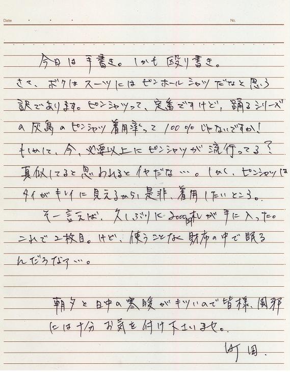 100円均一のお店でスリッパを物色しに行った時の事。ボクは山積みになっているスリッパを見ながら困っていた。チェック柄や縦縞の柄とか色々あるもんだ。だけど、どれもセンスが悪すぎるんだ。でもボクが使う訳ではないのでどれでもいいと言えばそれまでだけどね。けど、その山積みからいい色のスリッパを選びたいじゃん。気になる柄を一つずつフロアに並べてみると微妙にサイズが違う。さすが100均だなと関心しながら緑色の柄に・・・したっけ?忘れた。ついでに色々と物色してたらA4サイズの書類ケースみたいなものを見つけた。おお、これはあれば便利だと思いカゴに入れる。メモ用紙を切らしかけてたのを思い出し、レポート用紙を探す。しかしこれが見事に全部罫線入りのやつばっかり。ボクは罫線入りの用紙が苦手なんだ。何を書き込んでもまず最初に罫線を強烈に感じてしまうし、書いた字がキレイに見えない。ボクは書道してたお陰で縦も横もそれなりにきれいに書けるから罫線が不要。アルファベットのpとかqとかgとか書くときに下の行にはみ出てしまうのがキライ。何より、罫線で区切られると字に個性が出ないよね。でも店に罫線無しのレポ用紙が無いんだから仕方ないので罫線入りを買う。100円だからーーーなんて思っていたけど今も結局使わず仕舞い。ん~。ところでこのA4サイズの書類入れみたいなやつ、書類入れっぽいけどこんなのに書類を裸で入れたら書類の先端がボロボロになりそうなんだ。けどA4サイズのクリアファイルを入れることができないんですよ、この書類入れ。何かこれムカツクね。